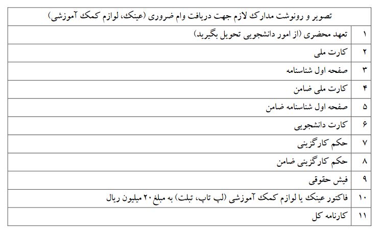 - 1- در طول دوره تحصیل 2 بار وام ضروری با عناوین عینک طبی و لوازم کمک آموزشی در 2 ترم متفاوت قابل دریافت است.