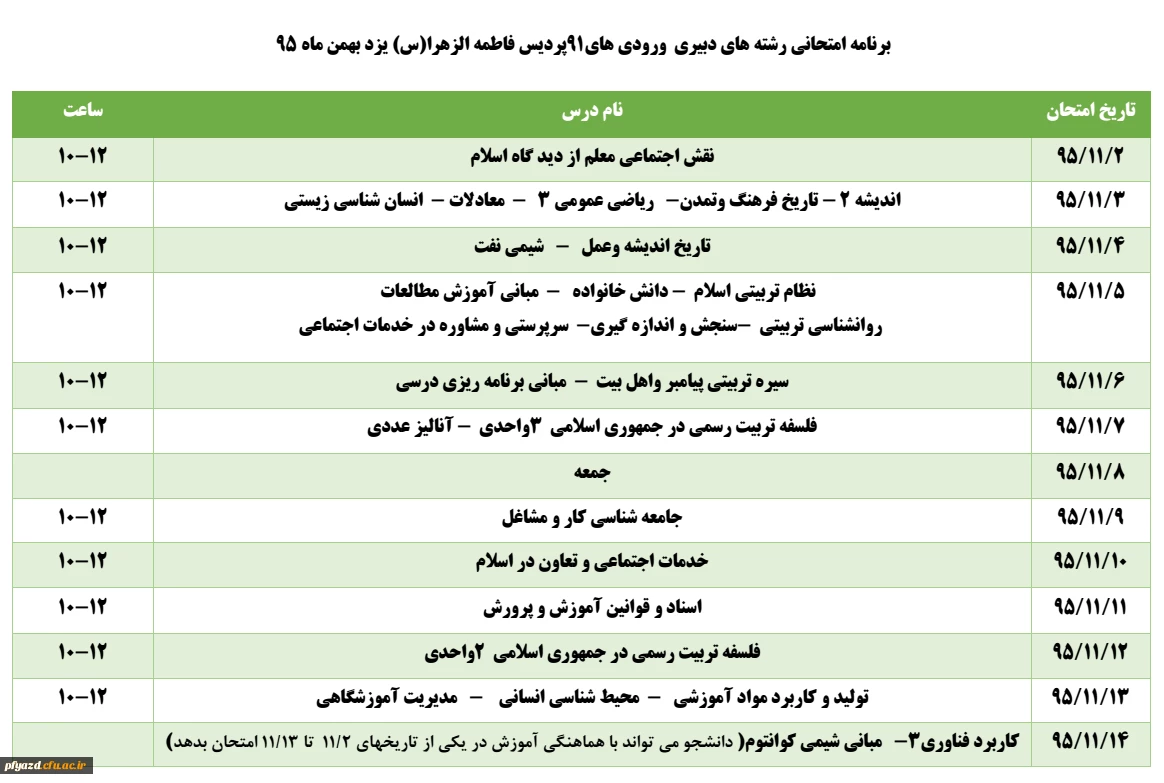 برنامه امتحانی رشته های دبیری ورودی های91پردیس فاطمه الزهرا(س) یزد بهمن ماه 95 2
