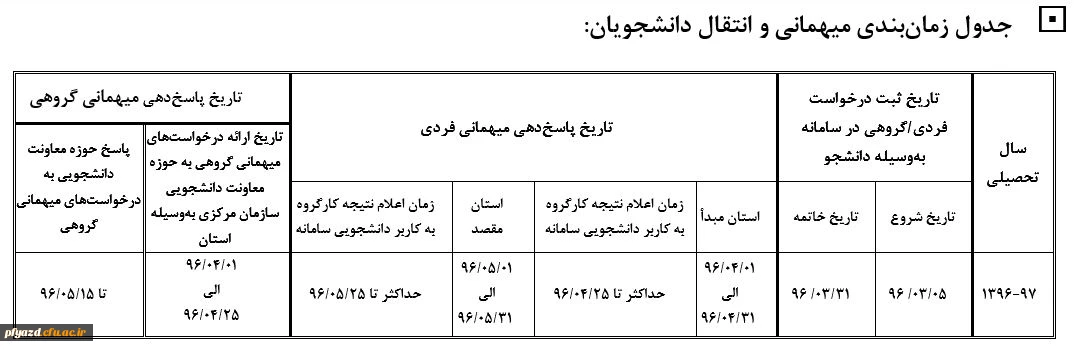امتیاز دهید : تقویم اجرایی مربوط به میهمانی و انتقال دانشجویان (برای سال تحصیلی 97-1396) 2 یکشنبه 7 خرداد 1396 ساعت 9:36