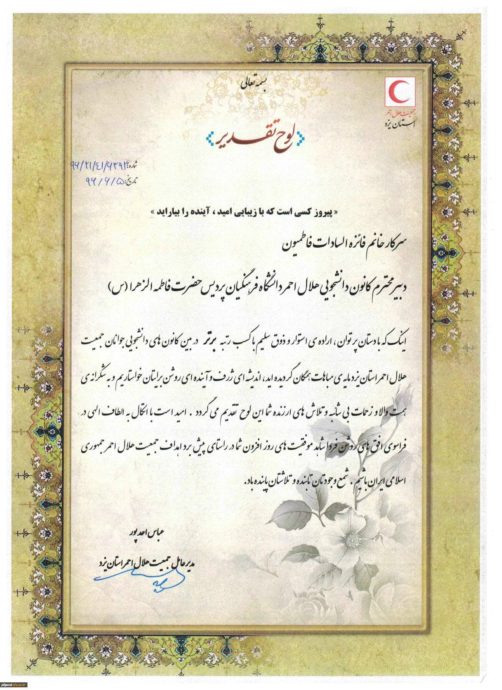 انتخاب کانون هلال احمر پردیس فاطمه الزهرا (س) به عنوان کانون برتر در بین کانون های دانشجویی جوانان هلال احمر استان یزد 2
