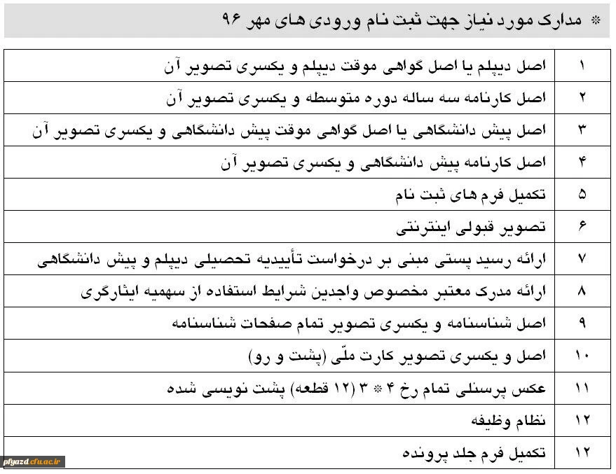 مدارک مورد نیاز جهت ثبت نام ورودی های 96 3