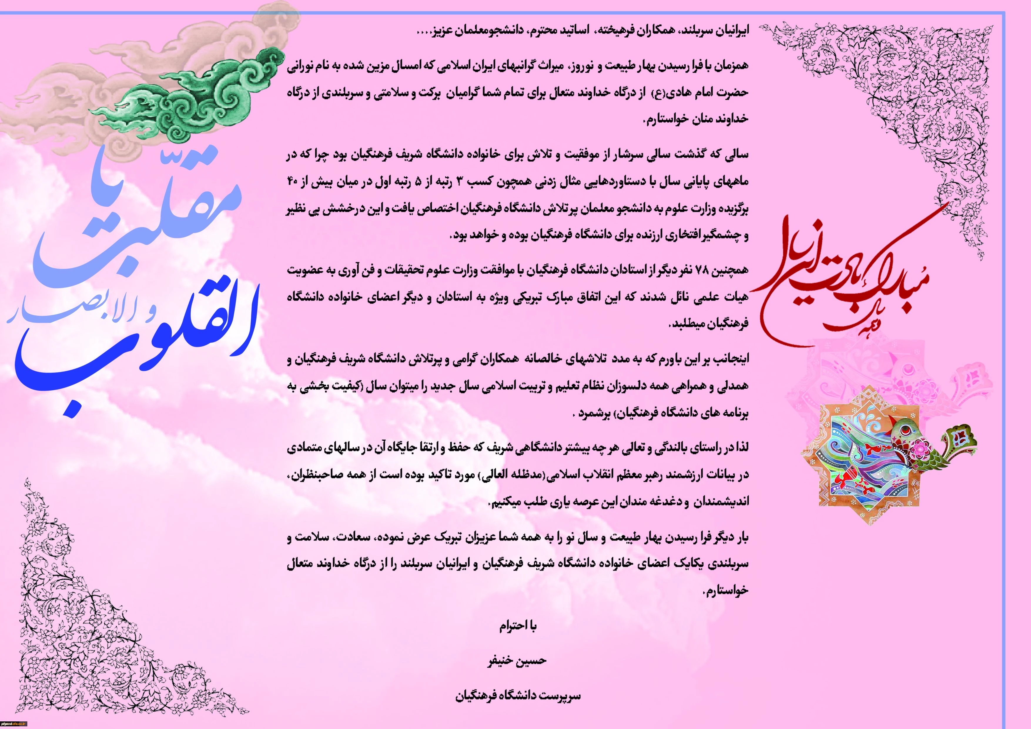 سرپرست دانشگاه فرهنگیان در پیام آغاز سال نو تاکید کرد: سالی که گذشت سرشار از موفقیت و تلاش برای خانواده دانشگاه شریف فرهنگیان بود 3