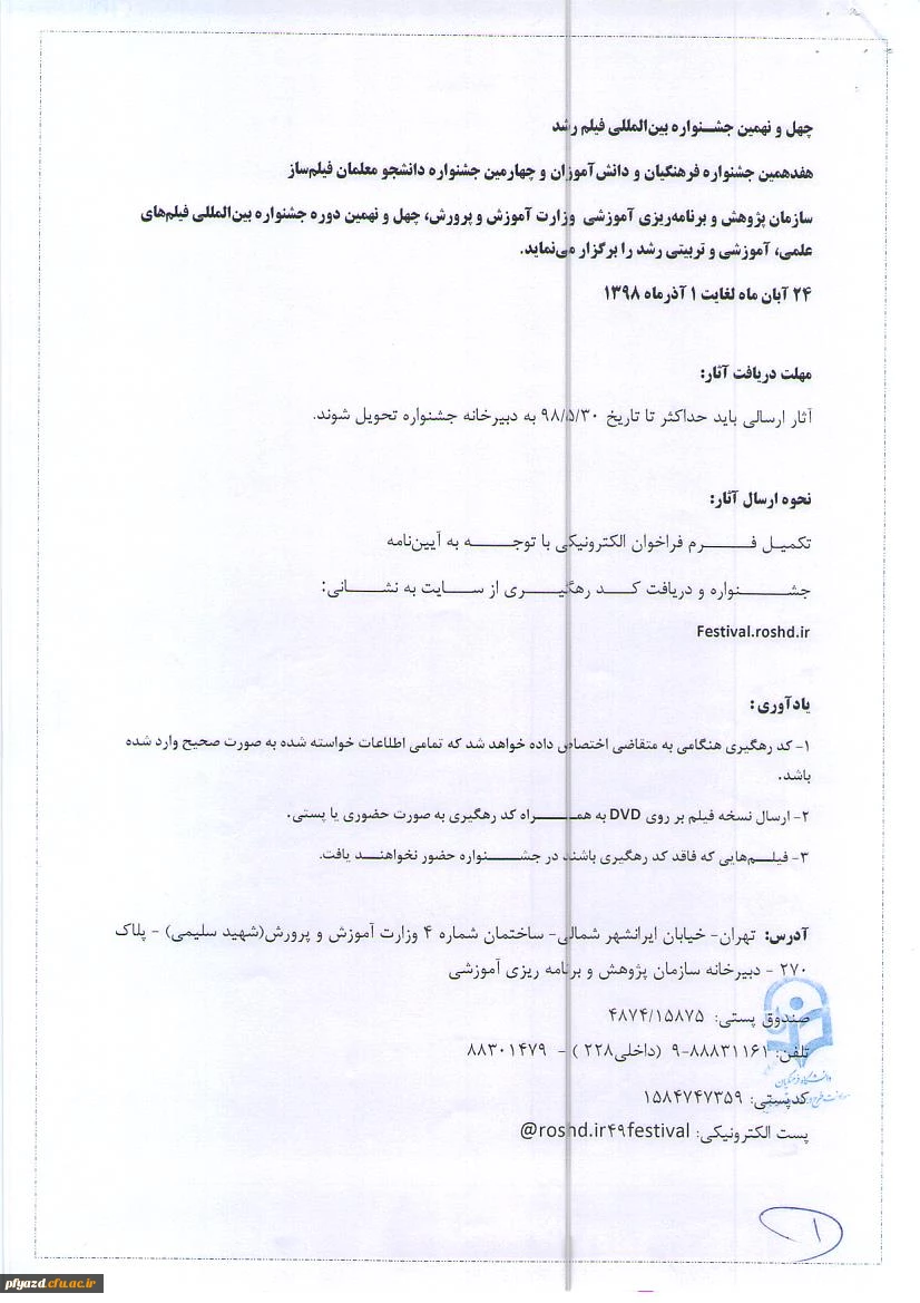 برگزاری چهل و نهمین جشنواره بین المللی فیلم رشد و هفدهمین جشنواره فرهنگیان و دانش آموزان و چهارمین جشنواره دانشجو معلمان فیلم ساز توسط سازمان پژوهش و برنامه ریزی آموزشی وزارت آموزش و پرورش از 24 آبان ماه لغایت 1 آذر ماه 3