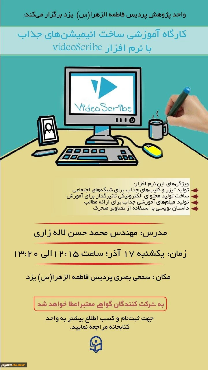 امتیاز دهید : کارگاه آموزشی ساخت انیمیشن های جذاب با نرم افزار ویدیواسکرایب 12 دوشنبه 18 آذر 1398 ساعت 9:48