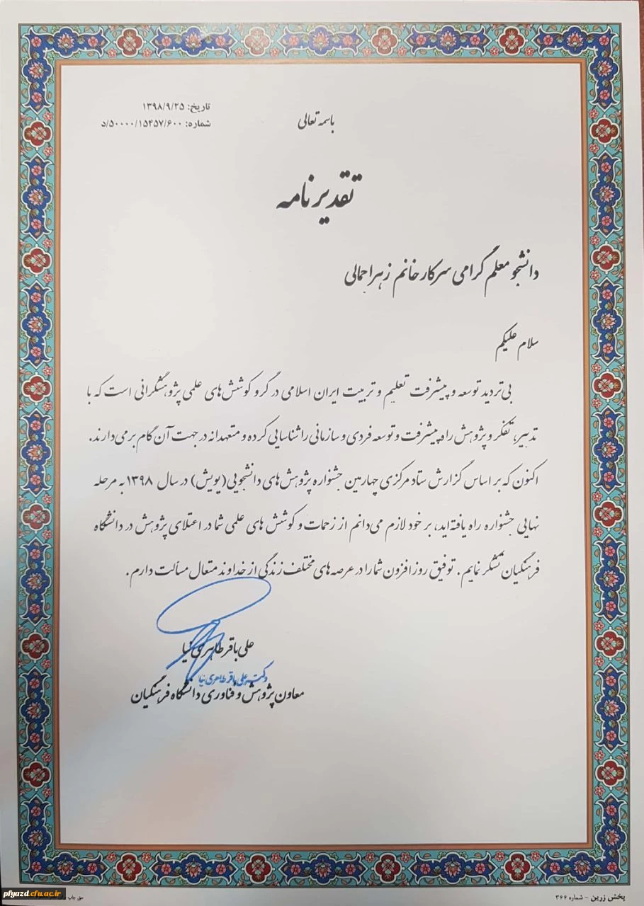 تقدیر از دانشجومعلم، زهرا جمالی راه یافته به رقابت های کشوری چهارمین جشنواره دانشجویی پویش 6
